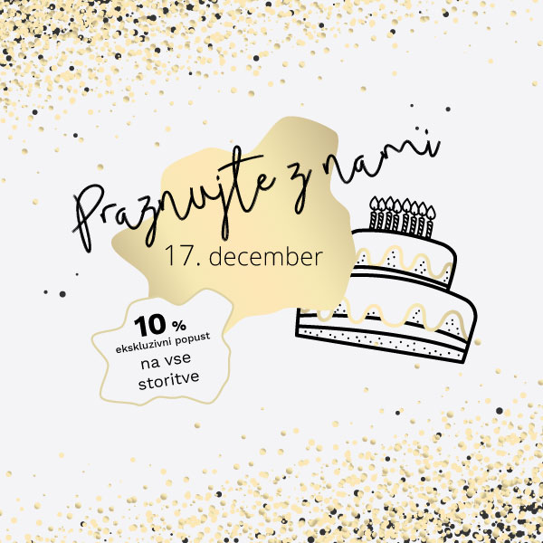 Veselje ob praznovanju želimo deliti, zato smo vam na naš rojstni dan, ki ga bomo skupaj z vami praznovali v ponedeljek, 17. 12. 2018, pripravili ekskluzivni 10 % popust ob nakupu katerekoli naše storitve.